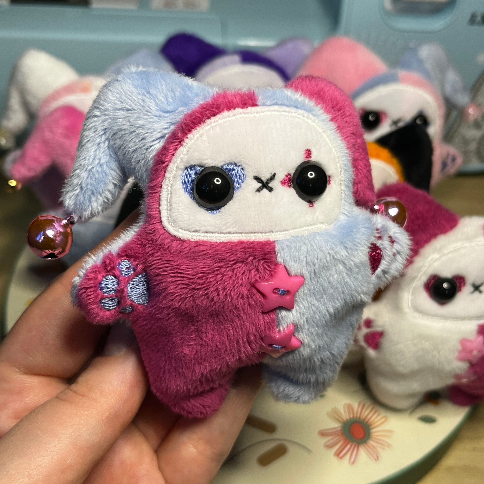Jester Cat Plushie - Magenta/Periwinkle with Bells